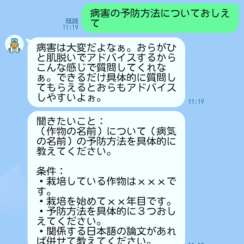 写真にあるのは、「農業版chatGPTアプリ、スーパー農家トミさん」ラインの機能です。